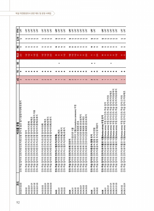 독일 자연환경조사 관련 제도 및 운영 사례집 코드 비오톱 유형 nG TE SE RLD RE § 30 FFH 34.02.01.02.03 건조-적습 입지의 건초지/반건초지/탄산염 암석 등 높은 염기 함량/아대륙/유휴지 3 ? 2-3 S § LRT 34.02.02 건조-적습 입지의 건초지/반건초지/규산염 암석 2 ? 1-2 S § LRT 34.02.02.01 건조-적습 입지의 건초지/반건초지/규산염 암석/아지중해 2 ? 1-2 S § LRT 34.02.02.01.01 건조-적습 입지의 건초지/반건초지/규산염 암석/아지중해/예초 1 ? 1! S § LRT 34.02.02.01.02 건조-적습 입지의 건초지/반건초지/규산염 암석/아지중해/방목지 이용 2 ? 1-2 S § LRT 34.02.02.01.03 건조-적습 ...