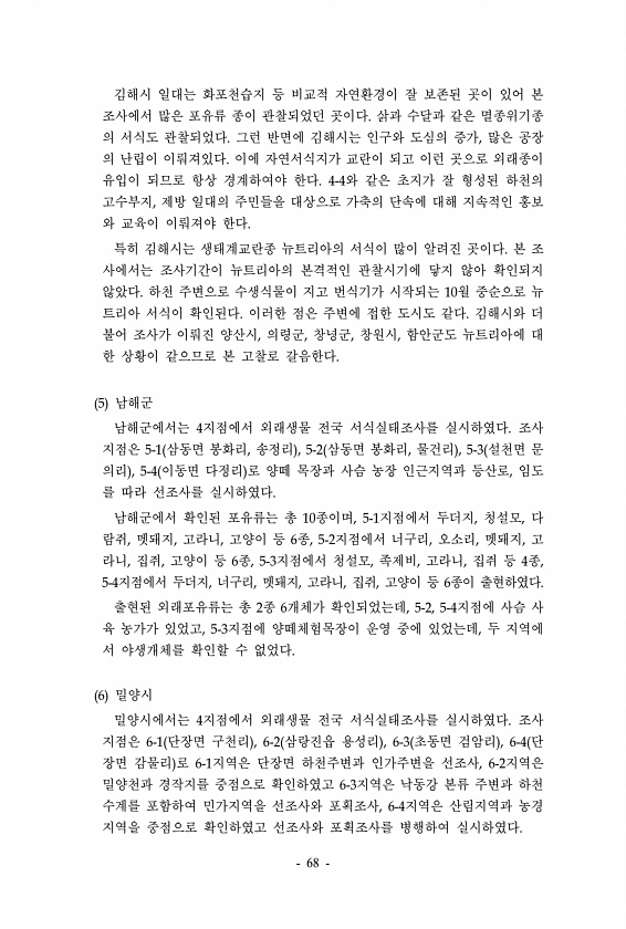 김해시 일대는 화포천습지 등 비교적 자연환경이 잘 보존된 곳이 있어 본 조사에서 많은 포유류 종이 관찰되었던 곳이다. 삵과 수달과 같은 멸종위기종 의 서식도 관찰되었다. 그런 반면에 김해시는 인구와 도심의 증가, 많은 공장 의 난립이 이뤄져있다. 이에 자연서식지가 교란이 되고 이런 곳으로 외래종이 유입이 되므로 항상 경계하여야 한다. 4-4와 같은 초지가 잘 형성된 하천의 고수부지, 제방 일대의 주민들을 대상으로 가축의 단속에 대해 지속적인 홍보 와 교육이 이뤄져야 한다. 특히 김해시는 생태계교란종 뉴트리아의 서식이 많이 알려진 곳이다. 본 조 사에서는 조사기간이 뉴트리아의 본격적인 관찰시기에 닿지 않아 확인되지 않았다. 하천 주변으로 수생식물이 지고 번식기가 시작되는 10월 중순으로 뉴 트리아 서식이 확인...