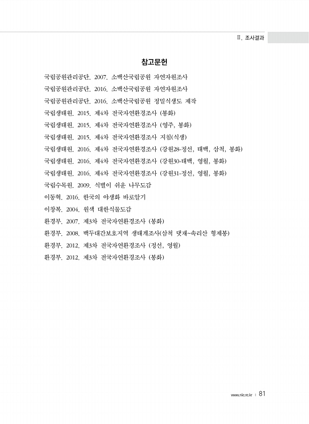 Ⅱ. 조사결과 www.nie.re.kr ? 81 참고문헌 국립공원관리공단. 2007. 소백산국립공원 자연자원조사 국립공원관리공단. 2016. 소백산국립공원 자연자원조사 국립공원관리공단. 2016. 소백산국립공원 정밀식생도 제작 국립생태원. 2015. 제4차 전국자연환경조사 봉화 국립생태원. 2015. 제4차 전국자연환경조사 영주, 봉화 국립생태원. 2015. 제4차 전국자연환경조사 지침 식생 국립생태원. 2016. 제4차 전국자연환경조사 강원28-정선, 태백, 삼척, 봉화 국립생태원. 2016. 제4차 전국자연환경조사 강원30-태백, 영월, 봉화 국립생태원. 2016. 제4차 전국자연환경조사 강원31-정선, 영월, 봉화 국립수목원. 2009. 식별이 쉬운 나무도감 이동혁. 2016. 한국의 야생화 바로알기 ...