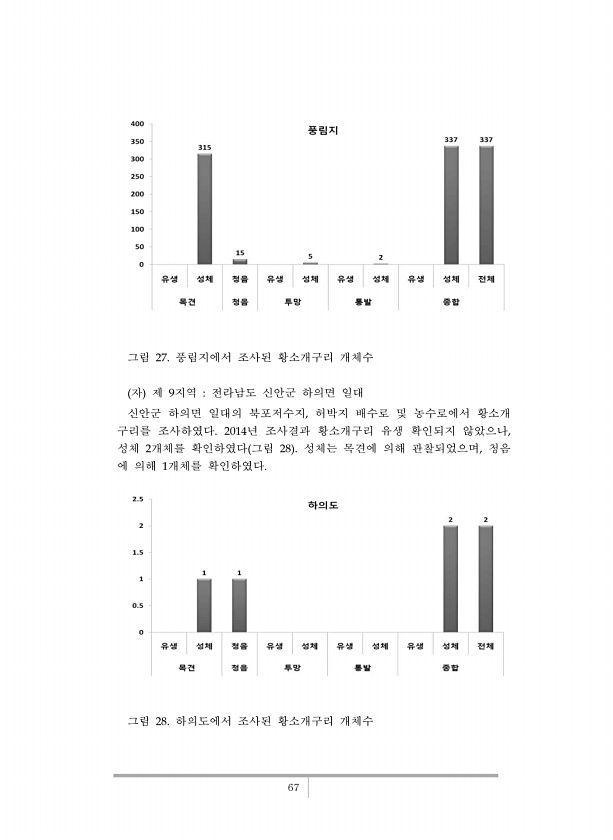 67 그림 27. 풍림지에서 조사된 황소개구리 개체수 자 제 9지역 전라남도 신안군 하의면 일대 신안군 하의면 일대의 북포저수지, 허박지 배수로 및 농수로에서 황소개 구리를 조사하였다. 2014년 조사결과 황소개구리 유생 확인되지 않았으나, 성체 2개체를 확인하였다 그림 28 성체는 목견에 의해 관찰되었으며, 청음 에 의해 1개체를 확인하였다. 그림 28. 하의도에서 조사된 황소개구리개체수