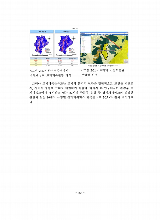 80 그림 환경영향평가시 개발대상지 토지피복현황 파악 그림 토지계 비점오염원 부하량 산정 그러나 토지피복분류도는 토지의 물리적 현황을 평면적으로 표현한 지도로 서 생태계 유형을 그대로 대변하기 어렵다 따라서 본 연구에서는 환경부 토 지피복도에서 제시하고 있는 개의 중분류 유형 중 생태계서비스와 밀접한 관련이 있는 개의 유형별 생태계서비스 항목을 표 와 같이 제시하였다