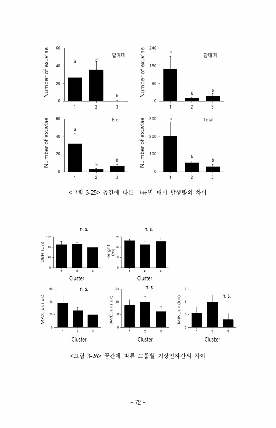 그림 3-25 공간에 따른 그룹별 매미 발생량의 차이 그림 3-26 공간에 따른 그룹별 기상인자간의 차이 72