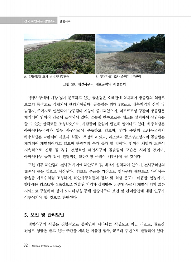전국 해안사구 정밀조사 맹방사구 82 ? National Institute of Ecology A. 2차 여름 조사 순비기나무군락 B. 3차 가을 조사 순비기나무군락 그림 29. 해안사구의 대표군락의 계절변화 맹방사구에서 가장 넓게 분포하고 있는 곰솔림은 오래전에 식재되어 방풍림의 역할로 보호의 목적으로 식재되어 관리되어왔다. 곰솔림은 최대 250m로 배후지역의 산지 및 농경지, 주거지로 연결되어 방풍림의 기능이 증가되었으며, 리조트조성 구간의 방풍림은 제거되어 인위적 건물이 조성되어 있다. 곰솔림 안쪽으로는 데크를 설치하여 삼림욕을 할 수 있는 산책로를 조성하였으며, 사람들의 출입이 빈번히 일어나고 있다. 하층식생은 아까시나무군락과 일부 사구식물이 분포하고 있으며, 민가 주변의 소나무군락의 하층식생은 교란...