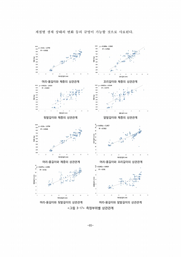 -65- 계절별 생체 상태의 변화 등의 규명이 가능할 것으로 사료된다. 머리-몸길이와 체중의 상관관계 꼬리길이와 체중의 상관관계 뒷발길이와 체중의 상관관계 앞발길이와 체중의 상관관계 머리-몸길이와 체중의 상관관계 머리-몸길이와 꼬리길이의 상관관계 머리-몸길이와 뒷발길이의 상관관계 머리-몸길이와 앞발길이의 상관관계 그림 3-17 측정부위별상관관계