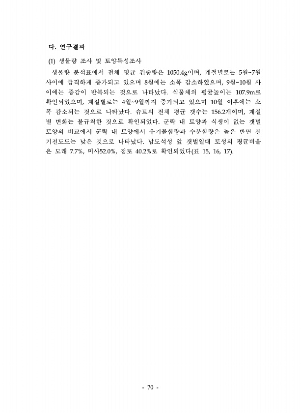 70 다. 연구결과 1 생물량 조사 및 토양특성조사 생물량 분석표에서 전체 평균 건중량은 1050.4g이며, 계절별로는 5월7월 사이에 급격하게 증가되고 있으며 8월에는 소폭 감소하였으며, 9월10월 사 이에는 증감이 반복되는 것으로 나타났다. 식물체의 평균높이는 107.9m로 확인되었으며, 계절별로는 4월9월까지 증가되고 있으며 10월 이후에는 소 폭 감소되는 것으로 나타났다. 슈트의 전체 평균 갯수는 156.2개이며, 계절 별 변화는 불규칙한 것으로 확인되었다. 군락 내 토양과 식생이 없는 갯벌 토양의 비교에서 군락 내 토양에서 유기물함량과 수분함량은 높은 반면 전 기전도도는 낮은 것으로 나타났다. 남도석성 앞 갯벌일대 토성의 평균비율 은 모래 7.7%, 미사52.0%, 점토 40.2%로 확인되었다 표 ...