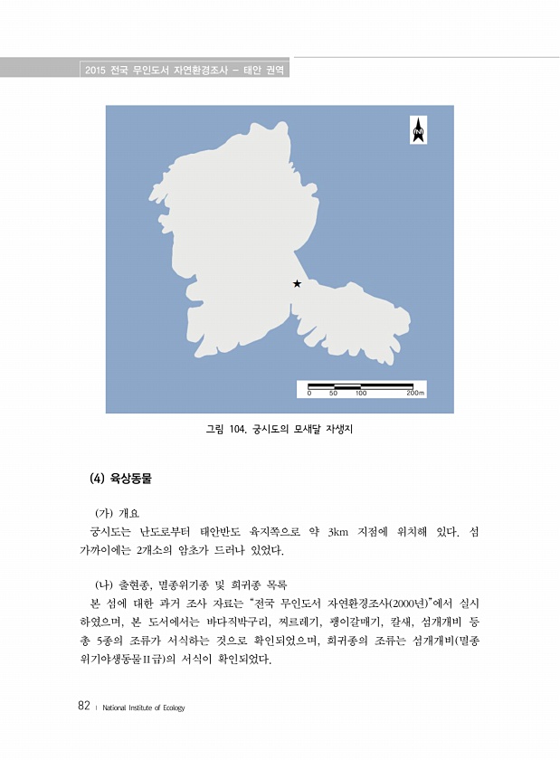 2015 전국 무인도서 자연환경조사 태안 권역 82 ? National Institute of Ecology 그림 104. 궁시도의 모새달 자생지 4 육상동물 가 개요 궁시도는 난도로부터 태안반도 육지쪽으로 약 3km 지점에 위치해 있다. 섬 가까이에는 2개소의 암초가 드러나 있었다. 나 출현종, 멸종위기종 및 희귀종 목록 본 섬에 대한 과거 조사 자료는 “전국 무인도서 자연환경조사 2000년 ”에서 실시 하였으며, 본 도서에서는 바다직박구리, 찌르레기, 괭이갈매기, 칼새, 섬개개비 등 총 5종의 조류가 서식하는 것으로 확인되었으며, 희귀종의 조류는 섬개개비 멸종 위기야생동물Ⅱ급 의 서식이확인되었다.