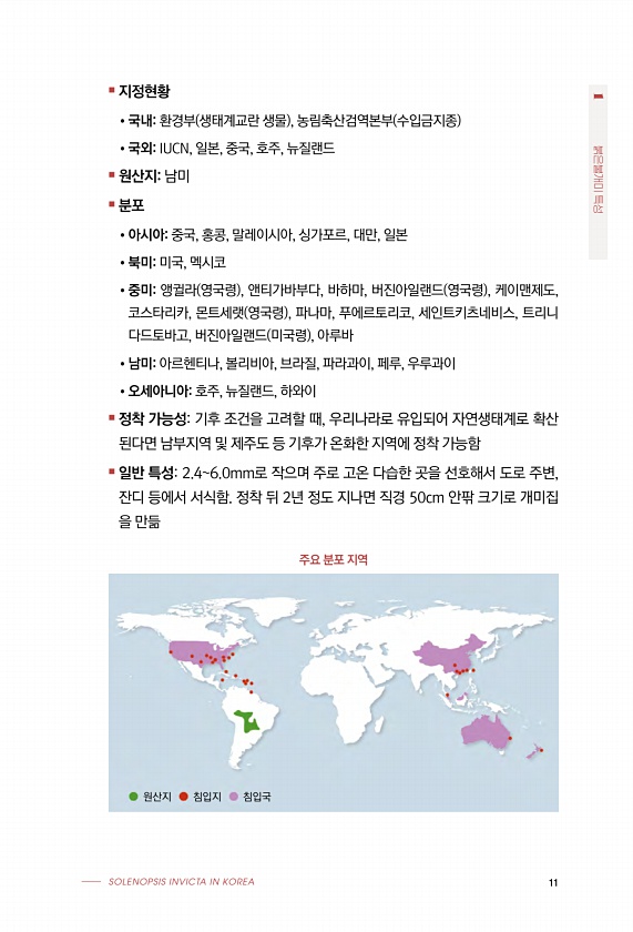 SOLENOPSIS INVICTA IN KOREA 11 1 붉은불개미 특성 ■ 지정현황 ?국내환경부 생태계교란 생물 , 농림축산검역본부 수입금지종 ?국외IUCN, 일본, 중국, 호주, 뉴질랜드 ■ 원산지남미 ■ 분포 ?아시아중국, 홍콩, 말레이시아, 싱가포르, 대만, 일본 ?북미미국, 멕시코 ?중미앵귈라 영국령 , 앤티가바부다, 바하마, 버진아일랜드 영국령 , 케이맨제도, 코스타리카, 몬트세랫 영국령 , 파나마, 푸에르토리코, 세인트키츠네비스, 트리니 다드토바고, 버진아일랜드 미국령 , 아루바 ?남미아르헨티나, 볼리비아, 브라질, 파라과이, 페루, 우루과이 ?오세아니아호주, 뉴질랜드, 하와이 ■ 정착 가능성기후 조건을 고려할 때, 우리나라로 유입되어 자연생태계로 확산 된다면 남부지역 및 제주도 등 기후가 온...