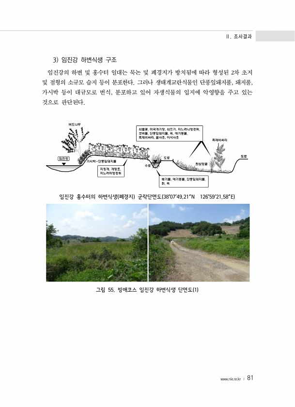 Ⅱ. 조사결과 www.nie.re.kr ? 81 3 임진강 하변식생 구조 임진강의 하변 및 홍수터 일대는 묵논 및 폐경지가 방치됨에 따라 형성된 2차 초지 및 점형의 소규모 습지 등이 분포한다. 그러나 생태계교란식물인 단풍잎돼지풀, 돼지풀, 가시박 등이 대규모로 번식, 분포하고 있어 자생식물의 입지에 악영향을 주고 있는 것으로 판단된다. 임진강 홍수터의 하변식생 폐경지 군락단면도 38°07′49.21″N 126°59′21.58″E 그림 55. 빙애코스 임진강 하변식생 단면도 1