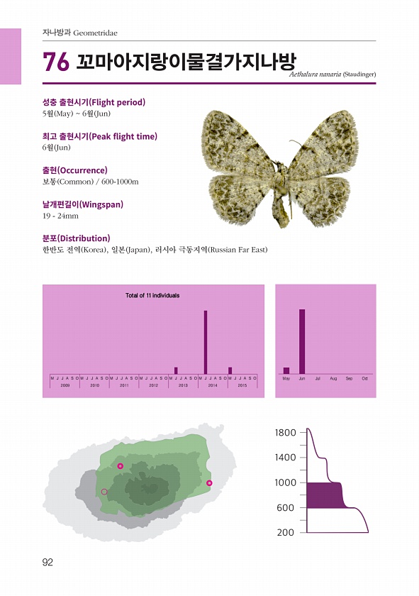 92 자나방과 Geometridae 성충 출현시기 Flight period 5월 May 6월 Jun 최고 출현시기 Peak fight time 6월 Jun 출현 Occurrence 보통 Common 600-1000m 날개편길이 Wingspan 19 24mm 분포 Distribution 한반도 전역 Korea , 일본 Japan , 러시아 극동지역 Russian Far East 76 꼬마아지랑이물결가지나방 Aethalura nanaria Staudinger M J J A S O M J J A S O M J J A S O M J J A S O M J J A S O M J J A S O M J J A S O May Jun Jul Aug Sep Oct 2009 2010 2011 2012 2013 2014 2015 ...