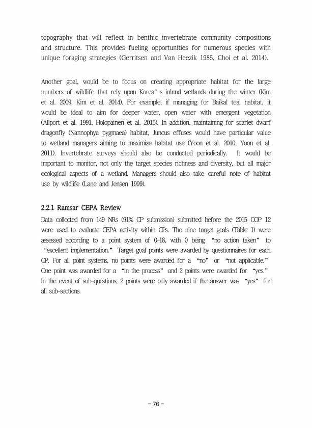 76 topography that will reflect in benthic invertebrate community compositions and structure. This provides fueling opportunities for numerous species with unique foraging strategies Gerritsen and Van Heezik 1985, Choi et al. 2014 Another goal, would be to focus on creating appropriate habitat for the large numbers of wildlife that rely upon Korea’s inland wetlands during the winter Kim et al. 200...
