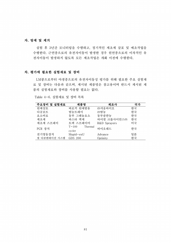 81 자. 방제 및 제거 실험 후 3년간 모니터링을 수행하고, 정기적인 제초제 살포 및 예초작업을 수행한다. 근연종으로의 유전자이동이 발생한 경우 원연종으로의 이차적인 유 전자이동이 발생하지 않도록 모든 제초작업은 개화 이전에 수행한다. 차. 평가에 필요한 실험재료 및 장비 LM콩으로부터 야생종으로의 유전자이동성 평가를 위해 필요한 주요 실험재 료 및 장비는 다음과 같으며, 제시된 제품명은 참고용이며 반드시 제시된 제 품의 실험재료와 장비를 사용할 필요는 없다. Table 4-6. 실험재료 및 장비 목록 주요장비 및 실험재료 제품명 제조사 국가 원예상토 바로커 원예범용 ㈜서울바이오 한국 다공포트 범농트레이 ㈜범농 한국 요소비료 동부 그레뉼요소 동부팜한농 한국 제초제 바스타 액제 바이엘 크롭사이언스㈜ 한국 제...