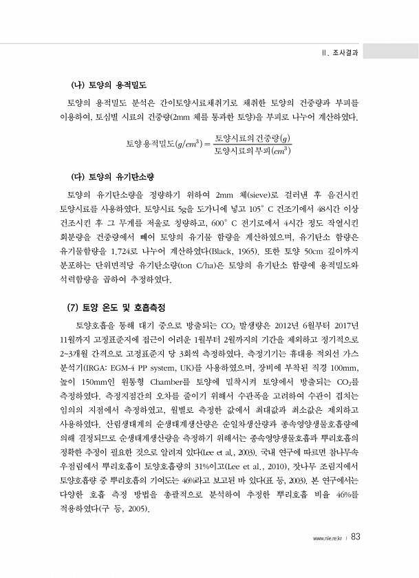 Ⅱ. 조사결과 www.nie.re.kr ? 83 나 토양의 용적밀도 토양의 용적밀도 분석은 간이토양시료채취기로 채취한 토양의 건중량과 부피를 이용하여, 토심별 시료의 건중량 2mm 체를 통과한 토양 을 부피로 나누어 계산하였다. 토양용적밀도??? 토양시료의부피?? 토양시료의건중량? 다 토양의 유기탄소량 토양의 유기탄소량을 정량하기 위하여 2mm 체 sieve 로 걸러낸 후 음건시킨 토양시료를 사용하였다. 토양시료 5g을 도가니에 넣고 105°C 건조기에서 48시간 이상 건조시킨 후 그 무게를 저울로 칭량하고, 600°C 전기로에서 4시간 정도 작열시킨 회분량을 건중량에서 빼어 토양의 유기물 함량을 계산하였으며, 유기탄소 함량은 유기물함량을 1.724로 나누어 계산하였다 Black, 19...