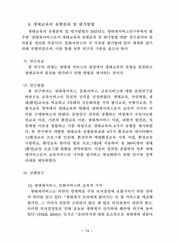 74 생태교육의 유형분류 및 평가방법 생태교육의 유형분류 및 평가방법은 년도 생태계서비스연구부에서 발 주한 생태계서비스로서 생태교육의 유형분류 및 평가방법 개발 연구용역의 결 과물을 정리한 부분이다 문화서비스의 각 지표를 평가함에 있어 체계를 잡기 위해 진행되었으며 이를 통해 차후 연구의 기반을 잡고자 한다 가 연구목표 본 연구의 과제는 생태계 서비스의 관점에서 생태교육의 유형을 분류하고 생태교육의 효과를 평가하기 위한 방법을 제시하는 것이다 나 연구방법 본 연구에서는 생태계서비스 문화서비스 교육서비스에 대한 문헌연구를 바탕으로 교육서비스의 특성과 성격을 규정하였다 생태교육 자연체험 생 태 환경 교육을 비교하고 차례의 자문회의를 거쳐 형식교육 비형식교육 무 형식교육 영역에서 생태교육의 현황과 생태계서비스로서...