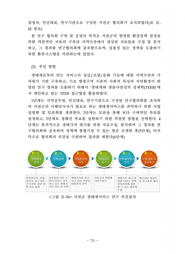 70 결정자 민간대표 연구기관으로 구성된 서천군 협의회가 조직하였다 표 참조 본 연구 협의회 구축 및 운영의 목적은 서천군의 현명한 환경정책 결정을 위한 객관적인 자료의 구축과 지역수준에서 생성된 자료들을 수집 및 분석 하고 그 결과를 연구협의회에 공유함으로써 실용성 있는 정책을 도출하기 위한 환류시스템을 마련하는데 있었다 추진 방법 생태계로부터 얻는 서비스의 공급 조절 문화 기능에 대한 지역수준의 가 치평가 기반 구축하고 기초 행정구역 수준의 사회적 특성과 자연환경이 반 영된 연구 결과를 도출하기 위해서 생태계와 생물다양성의 경제학 에 서 제안하고 있는 접근법을 활용하였다 단계는 지역공무원 민간대표 연구기관으로 구성된 연구협의회를 조직하 여 서천군의 이해당사자가 필요로 하는 생태계서비스를 파악하기 위한 사...