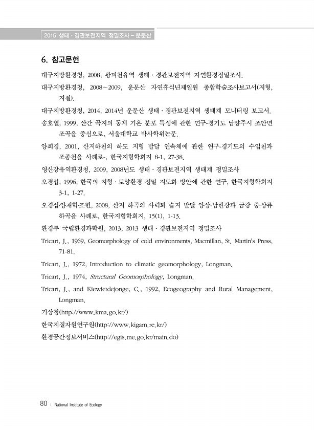 2015 생태·경관보전지역 정밀조사 운문산 80 ? National Institute of Ecology 6. 참고문헌 대구지방환경청, 2008, 왕피천유역 생태·경관보전지역 자연환경정밀조사. 대구지방환경청, 2008∼2009, 운문산 자연휴식년제일원 종합학술조사보고서 지형, 지질 대구지방환경청, 2014, 2014년 운문산 생태·경관보전지역 생태계 모니터링 보고서. 송호열, 1999, 산간 곡지의 동계 기온 분포 특성에 관한 연구-경기도 남양주시 조안면 조곡을 중심으로, 서울대학교 박사학위논문. 양희경, 2001, 산지하천의 하도 지형 발달 연속체에 관한 연구-경기도의 수입천과 조종천을 사례로-, 한국지형학회지 8-1, 27-38. 영산강유역환경청, 2009, 2008년도 생태·경관보전지역 생태계 정밀조사...