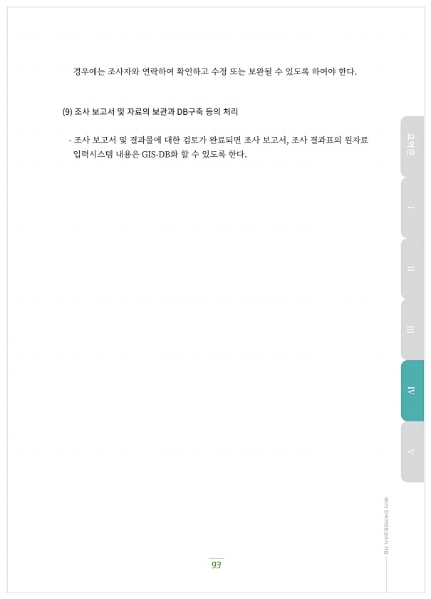 93 제5차 전국자연환경조사 지침 경우에는?조사자와?연락하여?확인하고?수정?또는?보완될?수?있도록?하여야?한다. 9 조사?보고서?및?자료의?보관과 DB구축?등의?처리 조사?보고서?및?결과물에?대한?검토가?완료되면?조사?보고서, 조사?결과표의?원자료 입력시스템?내용은 GIS-DB화?할?수?있도록?한다. 요약문 Ⅰ Ⅱ Ⅲ ⅣⅤ