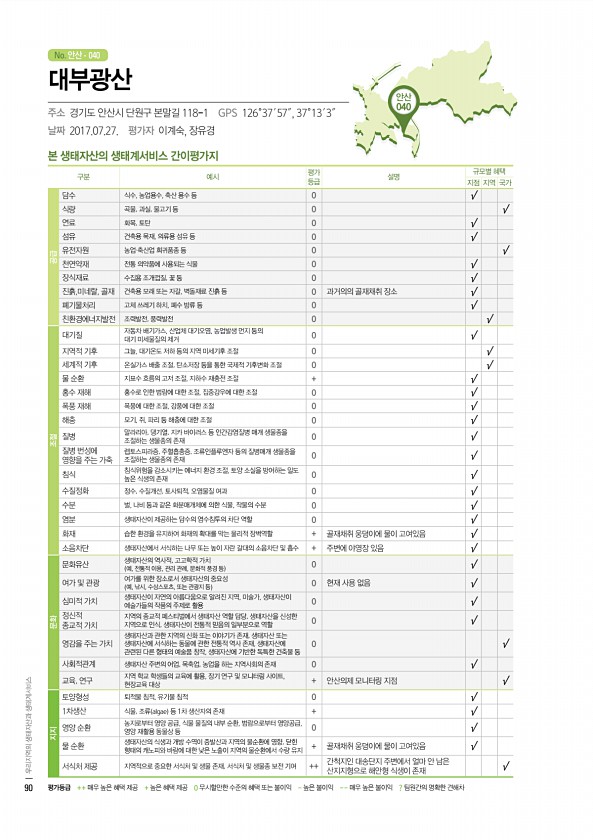 No. 안산 안산 040 본 생태자산의 생태계서비스 간이평가지 구분 예시 평가 등급 설명 규모별 혜택 지점 지역 국가 공급 담수 식수, 농업용수, 축산 용수 등 0 √ 식량 곡물, 과실, 물고기 등 0 √ 연료 화목, 토탄 0 √ 섬유 건축용 목재, 의류용 섬유 등 0 √ 유전자원 농업·축산업 희귀품종 등 0 √ 천연약재 전통 의약품에 사용되는 식물 0 √ 장식재료 수집용 조개껍질, 꽃 등 0 √ 진흙,미네랄, 골재 건축용 모래 또는 자갈, 벽돌재료 진흙 등 0 과거의의 골재채취 장소 √ 폐기물처리 고체 쓰레기 하치, 폐수 방류 등 0 √ 친환경에너지발전 조력발전, 풍력발전 0 √ 조절 대기질 자동차 배기가스, 산업체 대기오염, 농업발생 먼지 등의 대기 미세물질의 제거 0 √ 지역적 기후 그늘, 대기온도 저...