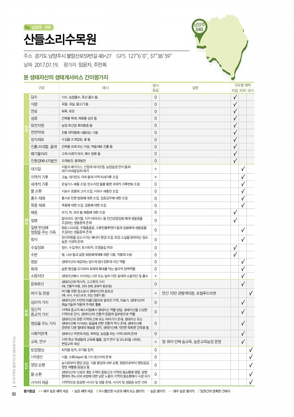 No. 남양주 남양주 040 본 생태자산의 생태계서비스 간이평가지 구분 예시 평가 등급 설명 규모별 혜택 지점 지역 국가 공급 담수 식수, 농업용수, 축산 용수 등 0 √ 식량 곡물, 과실, 물고기 등 0 √ 연료 화목, 토탄 0 √ 섬유 건축용 목재, 의류용 섬유 등 0 √ 유전자원 농업·축산업 희귀품종 등 0 √ 천연약재 전통 의약품에 사용되는 식물 0 √ 장식재료 수집용 조개껍질, 꽃 등 0 √ 진흙,미네랄, 골재 건축용 모래 또는 자갈, 벽돌재료 진흙 등 0 √ 폐기물처리 고체 쓰레기 하치, 폐수 방류 등 0 √ 친환경에너지발전 조력발전, 풍력발전 0 √ 조절 대기질 자동차 배기가스, 산업체 대기오염, 농업발생 먼지 등의 대기 미세물질의 제거 + √ 지역적 기후 그늘, 대기온도 저하 등의 지역 미세기...