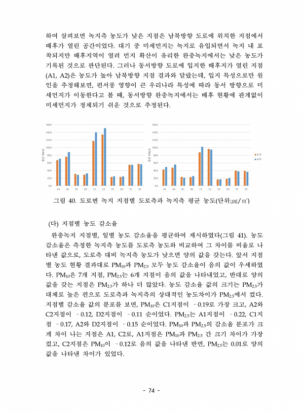 74 하여 살펴보면 녹지측 농도가 낮은 지점은 남북방향 도로에 위치한 지점에서 배후가 열린 공간이었다. 대기 중 미세먼지는 녹지로 유입되면서 녹지 내 포 착되지만 배후지역이 열려 먼지 확산이 유리한 완충녹지에서는 낮은 농도가 기록된 것으로 판단된다. 그러나 동서방향 도로에 입지한 배후지가 열린 지점 A1, A2 은 농도가 높아 남북방향 지점 결과와 달랐는데, 입지 특성으로만 원 인을 추정해보면, 편서풍 영향이 큰 우리나라 특성에 따라 동서 방향으로 미 세먼지가 이동한다고 볼 때, 동서방향 완충녹지에서는 배후 현황에 관계없이 미세먼지가 정체되기 쉬운 것으로 추정된다. 그림 40. 도로변 녹지 지점별 도로측과 녹지측 평균 농도 단위㎍/㎥ 다 지점별 농도 감소율 완충녹지 지점별, 일별 농도 감소율을 평균하여 제시...