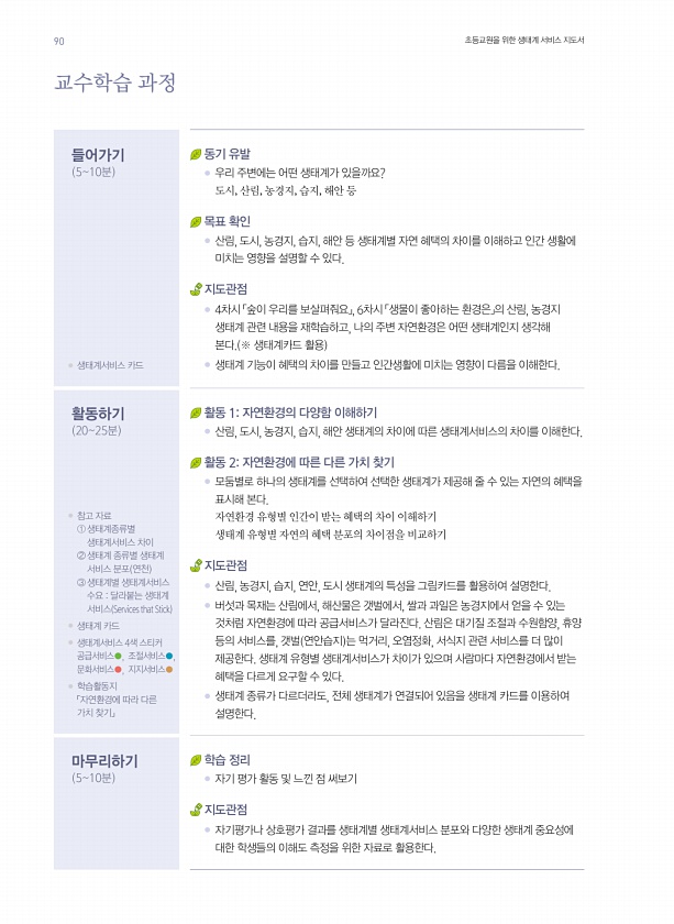 교수학습 과정 들어가기 510분 동기 유발 ● 우리 주변에는 어떤 생태계가 있을까요? 도시, 산림, 농경지, 습지, 해안 등 목표 확인 ● 산림, 도시, 농경지, 습지, 해안 등 생태계별 자연 혜택의 차이를 이해하고 인간 생활에 미치는 영향을 설명할 수 있다. 지도관점 ● 4차시 「숲이 우리를 보살펴줘요」, 6차시 「생물이 좋아하는 환경은」의 산림, 농경지 생태계 관련 내용을 재학습하고, 나의 주변 자연환경은 어떤 생태계인지 생각해 본다. ※ 생태계카드 활용 ● 생태계서비스 카드 ● 생태계 기능이 혜택의 차이를 만들고 인간생활에 미치는 영향이 다름을 이해한다. 활동하기 2025분 활동 1자연환경의 다양함 이해하기 ● 산림, 도시, 농경지, 습지, 해안 생태계의 차이에 따른 생태계서비스의 차이를 이해한다. 활...
