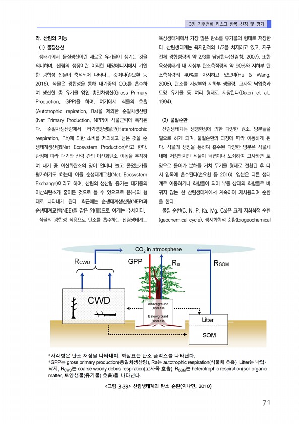 3장 기후변화 리스크 항목 선정 및 평가 71 라. 산림의 기능 1 물질생산 생태계에서 물질생산이란 새로운 유기물이 생기는 것을 의미하며, 산림의 생장이란 이러한 태양에너지에서 기인 한 광합성 산물이 축적되어 나타나는 것이다 손요환 등 2016 식물은 광합성을 통해 대기중의 CO2를 흡수하 여 생산한 총 유기물 양인 총일차생산 Gross Primary Production, GPP 을 하며, 여기에서 식물의 호흡 Autotrophic repiration, Ra 을 제외한 순일차생산량 Net Primary Production, NPP 이 식물군락에 축적된 다. 순일차생산량에서 타가영양생물군 Heterotrophic respiration, Rh 에 의한 소비를 제외하고 남은 것을 순 생태계생산량 Net Ecosy...