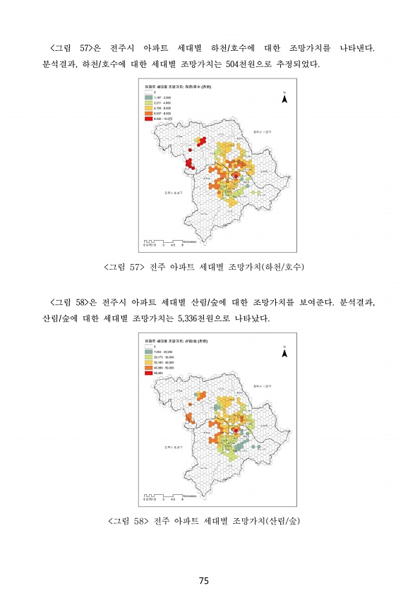 75 그림 57 은 전주시 아파트 세대별 하천/호수에 대한 조망가치를 나타낸다. 분석결과, 하천/호수에 대한 세대별 조망가치는 504천원으로 추정되었다. 그림 57 전주 아파트 세대별 조망가치 하천/호수 그림 58 은 전주시 아파트 세대별 산림/숲에 대한 조망가치를 보여준다. 분석결과, 산림/숲에 대한 세대별 조망가치는 5,336천원으로 나타났다. 그림 58 전주 아파트 세대별 조망가치 산림/숲