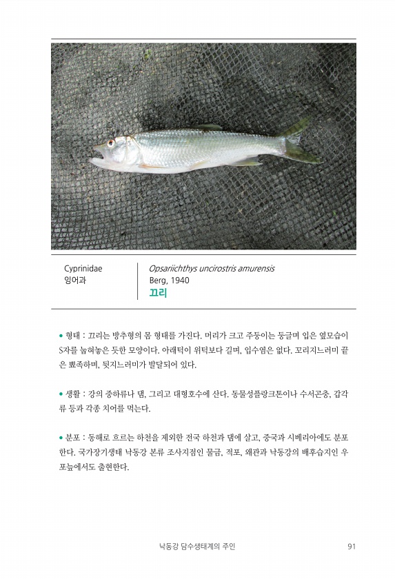 낙동강 담수생태계의 주인 91 ? 형태 끄리는 방추형의 몸 형태를 가진다. 머리가 크고 주둥이는 둥글며 입은 옆모습이 S자를 눕혀놓은 듯한 모양이다. 아래턱이 위턱보다 길며, 입수염은 없다. 꼬리지느러미 끝 은 뾰족하며, 뒷지느러미가 발달되어 있다. ? 생활 강의 중하류나 댐, 그리고 대형호수에 산다. 동물성플랑크톤이나 수서곤충, 갑각 류 등과 각종 치어를 먹는다. ? 분포 동해로 흐르는 하천을 제외한 전국 하천과 댐에 살고, 중국과 시베리아에도 분포 한다. 국가장기생태 낙동강 본류 조사지점인 물금, 적포, 왜관과 낙동강의 배후습지인 우 포늪에서도 출현한다. Cyprinidae 잉어과 Opsariichthys uncirostris amurensis Berg, 1940끄리