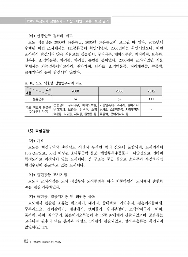 2015 특정도서 정밀조사 서산·태안·고흥·보성 권역 82 ? National Institute of Ecology 마 선행연구 결과와 비교 묘도 식물상은 2000년 74분류군, 2006년 57분류군이 보고된 바 있다. 2015년에 수행된 이번 조사에서는 111분류군이 확인되었다. 2000년에는 확인되었으나, 이번 조사에서 발견되지 않은 식물로는 갯능쟁이, 꾸지나무, 매화노루발, 반디지치, 보춘화, 산부추, 소엽맥문동, 자귀풀, 자리공, 좁쌀풀 등이었다. 2006년에 조사되었던 식물 중에서는 가는잎족제비고사리, 길마가지, 난사초, 소엽맥문동, 지리개관중, 쪽동백, 큰애기나리 등이 발견되지 않았다. 표 16. 묘도 식물상 선행연구와의 비교 연도 내용 2000 2006 2015 분류군수 74 57 111 주요 ...