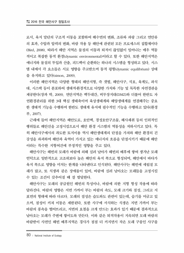 2016 전국 해안사구 정밀조사 80 ? National Institute of Ecology 로서, 육지 말단의 구조적 이동을 포함하여 해수면의 변화, 조류와 파랑 그리고 연안류 의 효과, 수압과 압력의 변화, 바람 작용 등 해안에 관련된 모든 프로세스의 집합체이다 Bird, 2008 따라서 해안 지역은 물질의 이동과 퇴적이 끊임없이 일어나는 매우 역동 적이고 복잡한 동적 환경 dynamic environmental 이라고 할 수 있다. 또한 해안지역은 에너지와 물질의 투입과 산출, 피드백이 순환하는 하나의 시스템을 형성하고 있다. 시스 템 내에서 각 요소들은 서로 영향을 주고받으며 동적 평형 dynamic equilibrium 상태 를 유지하고 있다 simon, 2009 이러한 해안지역은 다양한 형태의 ...