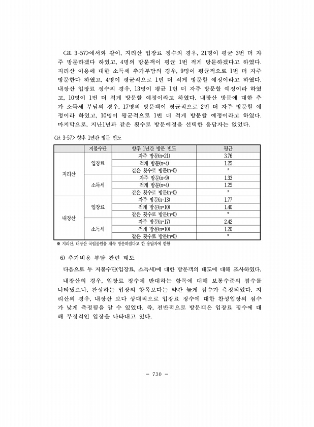 730 표 3-57 에서와 같이, 지리산 입장료 징수의 경우, 21명이 평균 3번 더 자 주 방문하겠다 하였고, 4명의 방문객이 평균 1번 적게 방문하겠다고 하였다. 지리산 이용에 대한 소득세 추가부담의 경우, 9명이 평균적으로 1번 더 자주 방문한다 하였고, 4명이 평균적으로 1번 더 적게 방문할 예정이라고 하였다. 내장산 입장료 징수의 경우, 13명이 평균 1번 더 자주 방문할 예정이라 하였 고, 10명이 1번 더 적게 방문할 예정이라고 하였다. 내장산 방문에 대한 추 가 소득세 부담의 경우, 17명의 방문객이 평균적으로 2번 더 자주 방문할 예 정이라 하였고, 10명이 평균적으로 1번 더 적게 방문할 예정이라고 하였다. 마지막으로, 지난1년과 같은 횟수로 방문예정을 선택한 응답자는 없었다. 지불수단 향...