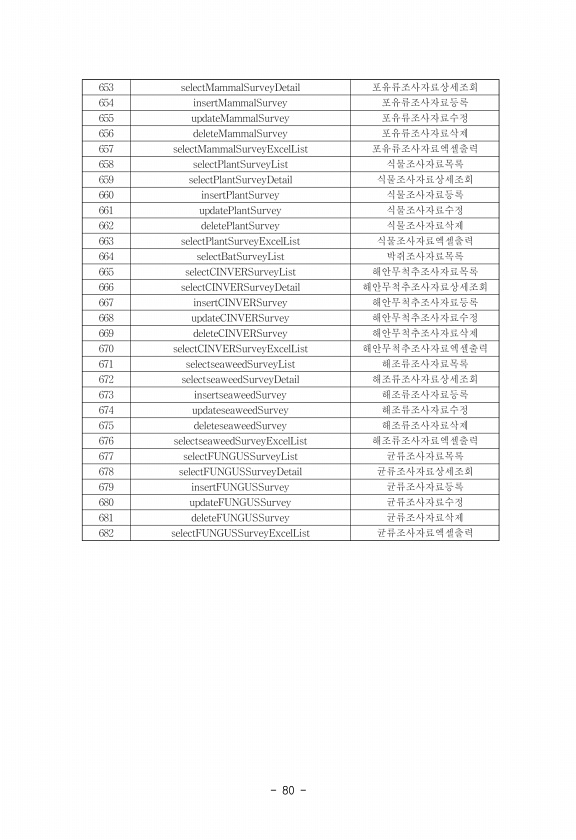 80 653 selectMammalSurveyDetail 포유류조사자료상세조회 65. insertMammalSurvey 포유류조사자료8록 655 updateMammalSurvey 포유류조사자료= 656 deleteMammalSurvey 포유류조사자료@A 659 selectMammalSurvey_`celist 포유류조사자료abcd 65? selectPlantSurveyist 식물조사자료목록 65B selectPlantSurveyDetail 식물조사자료상세조회 66G insertPlantSurvey 식물조사자료8록? updatePlantSurvey 식물조사자료? deletePlantSurvey 식물조사자료@A 663 selectPlantSurvey_`celist 식물조사자료abcd 66. selectjatSur...