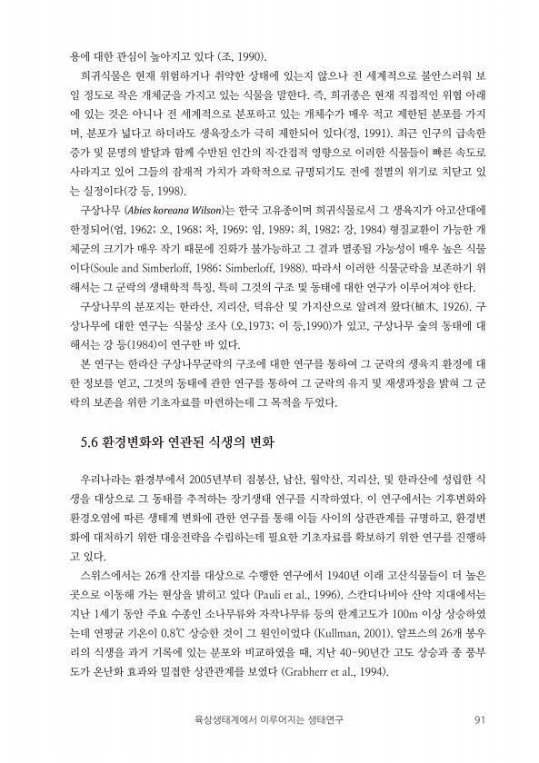 육상생태계에서 이루어지는 생태연구 91 용에 대한 관심이 높아지고 있다 조, 1990 희귀식물은 현재 위험하거나 취약한 상태에 있는지 않으나 전 세계적으로 불안스러워 보 일 정도로 작은 개체군을 가지고 있는 식물을 말한다. 즉, 희귀종은 현재 직접적인 위협 아래 에 있는 것은 아니나 전 세계적으로 분포하고 있는 개체수가 매우 적고 제한된 분포를 가지 며, 분포가 넓다고 하더라도 생육장소가 극히 제한되어 있다 정, 1991 최근 인구의 급속한 증가 및 문명의 발달과 함께 수반된 인간의 직·간접적 영향으로 이러한 식물들이 빠른 속도로 사라지고 있어 그들의 잠재적 가치가 과학적으로 규명되기도 전에 절멸의 위기로 치닫고 있 는 실정이다 강 등, 1998 구상나무 Abies koreana Wilson 는 한국 고유종...