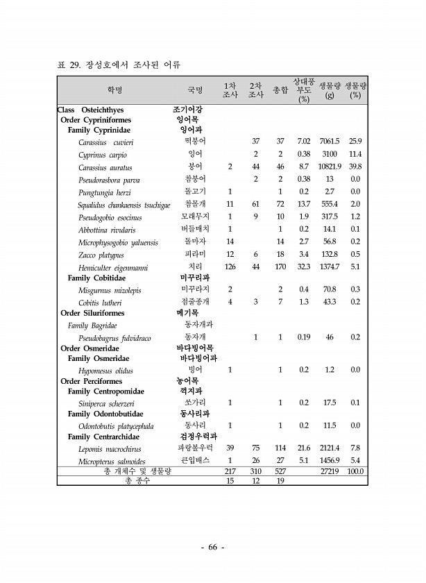 66 학명 국명 1차 조사 2차 조사 총합 상대풍 부도 % 생물량 g 생물량 % Class Osteichthyes 조기어강 Order Cypriniformes 잉어목 Family Cyprinidae 잉어과 Carassius cuvieri 떡붕어 37 37 7.02 7061.5 25.9 Cyprinus carpio 잉어 2 2 0.38 3100 11.4 Carassius auratus 붕어 2 44 46 8.7 10821.9 39.8 Pseudorasbora parva 참붕어 2 2 0.38 13 0.0 Pungtungia herzi 돌고기 1 1 0.2 2.7 0.0 Squalidus chankaensis tsuchigae 참몰개 11 61 72 13.7 555.4 2.0 Pseudogobio esocinu...
