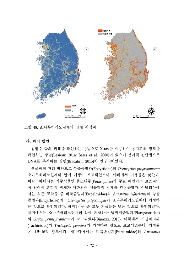 72 그림 48. 소나무허리노린재의 잠재 서식지 라. 관리 방안 침엽수 등의 피해를 확인하는 방법으로 X-ray를 이용하여 종자피해 정도를 확인하는 방법 Lesieur, 2014; Bates et al., 2000 이 있으며 분자적 진단법으로 DNA를 추적하는 방법 Bracalini, 2015 이 연구되어있다. 생물학적 관리 방안으로 깡충좀벌과 Encyrtidae 의 Ooencyrtus pityocampae는 소나무허리노린재의 알에 기생이 보고되었으나, 야외에서 기생률은 낮았다. 이탈리아에서는 기주식물인 돌소나무 Pinus pinea 가 주로 해안가의 보호지역 에 있어서 화학적 방제가 제한되어 생물학적 방제를 권장하였다. 이탈리아에 서는 최근 토착종 중 벼룩좀벌과 Eupelmidae 의 Anastatus b...