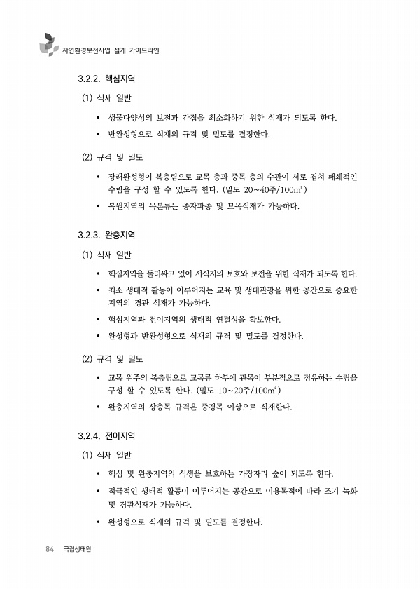84 국립생태원 자연환경보전사업 설계 가이드라인 3.2.2. 핵심지역 1 식재 일반 생물다양성의 보전과 간접을 최소화하기 위한 식재가 되도록 한다. 반완성형으로 식재의 규격 및 밀도를 결정한다. 2 규격 및 밀도 장래완성형이 복층림으로 교목 층과 중목 층의 수관이 서로 겹쳐 패쇄적인 수림을 구성 할 수 있도록 한다. 밀도 20∼40주/100m² 복원지역의 목본류는 종자파종 및 묘목식재가 가능하다. 3.2.3. 완충지역 1 식재 일반 핵심지역을 둘러싸고 있어 서식지의 보호와 보전을 위한 식재가 되도록 한다. 최소 생태적 활동이 이루어지는 교육 및 생태관광을 위한 공간으로 중요한 지역의 경관 식재가 가능하다. 핵심지역과 전이지역의 생태적 연결성을 확보한다. 완성형과 반완성형으로 식재의 규격 및 밀도를 결정한다....
