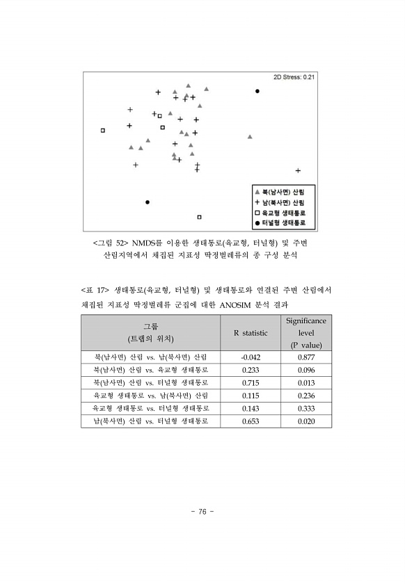 76 그림 52 NMDS를 이용한 생태통로 육교형, 터널형 및 주변 산림지역에서 채집된 지표성 딱정벌레류의 종 구성 분석 그룹 트랩의 위치 R statistic Significance level P value 북 남사면 산림 vs. 남 북사면 산림 -0.042 0.877 북 남사면 산림 vs. 육교형 생태통로 0.233 0.096 북 남사면 산림 vs. 터널형 생태통로 0.715 0.013 육교형 생태통로 vs. 남 북사면 산림 0.115 0.236 육교형 생태통로 vs. 터널형 생태통로 0.143 0.333 남 북사면 산림 vs. 터널형 생태통로 0.653 0.020 표 17 생태통로 육교형, 터널형 및 생태통로와 연결된 주변 산림에서 채집된 지표성 딱정벌레류 군집에 대한 ANOSIM 분석결과