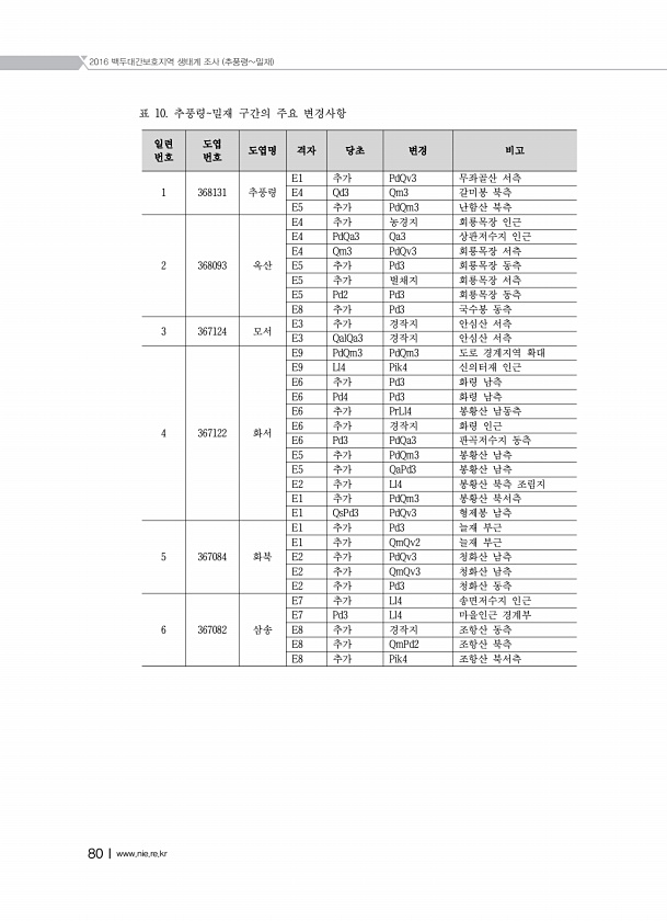 2016 백두대간보호지역 생태계 조사 추풍령밀재 80Ⅰwww.nie.re.kr 표 10. 추풍령밀재 구간의 주요 변경사항 일련 번호 도엽 번호 도엽명 격자 당초 변경 비고 1 368131 추풍령 E1 추가 PdQv3 무좌골산 서측 E4 Qd3 Qm3 갈미봉 북측 E5 추가 PdQm3 난함산 북측 2 368093 옥산 E4 추가 농경지 회룡목장 인근 E4 PdQa3 Qa3 상판저수지 인근 E4 Qm3 PdQv3 회룡목장 서측 E5 추가 Pd3 회룡목장 동측 E5 추가 벌채지 회룡목장 서측 E5 Pd2 Pd3 회룡목장 동측 E8 추가 Pd3 국수봉 동측 3 367124 모서 E3 추가 경작지 안심산 서측 E3 QalQa3 경작지 안심산 서측 4 367122 화서 E9 PdQm3 PdQm3 도로 경계지역 확대 E...