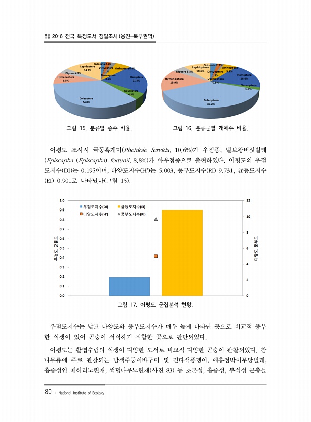 2016 전국 특정도서 정밀조사 옹진-북부권역 80 ? National Institute of Ecology 그림 15. 분류별 종수 비율. 그림 16. 분류군별 개체수 비율. 어평도 조사시 극동혹개미 Pheidole fervida, 10.6% 가 우점종, 털보왕버섯벌레 Episcapha Episcapha fortunii, 8.8% 가 아우점종으로 출현하였다. 어평도의 우점 도지수 DI 는 0.195이며, 다양도지수 H는 5.003, 풍부도지수 RI 9.731, 균등도지수 EI 0.901로 나타났다 그림 15 그림 17. 어평도 군집분석 현황. 우점도지수는 낮고 다양도와 풍부도지수가 매우 높게 나타난 곳으로 비교적 풍부 한 식생이 있어 곤충이 서식하기 적합한 곳으로 판단되었다. 어평도는 활엽수림의 식생이 다...