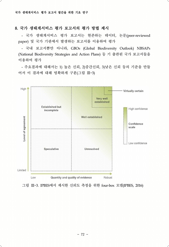 국가 생태계서비스 평가 보고서 발간을 위한 기초 연구 72 8. 국가 생태계서비스 평가 보고서의 평가 방법 제시 국가 생태계서비스 평가 보고서는 현존하는 데이터, 논문 peer-reviewed paper 및 국가 기관에서 발생하는 보고서를 이용하여 평가 국내 보고서뿐만 아니라, GBOs Global Biodiversity Outlook NBSAPs National Biodiversity Strategies and Action Plans 등 기 출판된 국가 보고서들을 이용하여 평가 주요결과에 대해서는 1 높은 신뢰, 2 중간신뢰, 3 낮은 신뢰 등의 기준을 만들 어서 이 결과에 대해 명확하게 구분 그림 Ⅲ 3 그림 Ⅲ 3. IPBES에서 제시한 신뢰도 측정을 위한 four-box 모델 IPBES, 2016