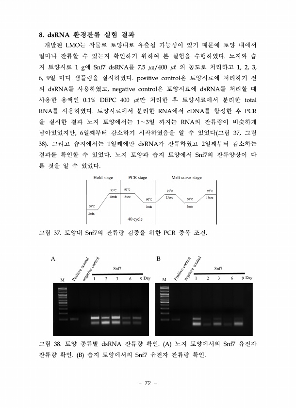 8. dsRNA 환경잔류 실험 결과 개발된 LMO는 작물로 토양내로 유출될 가능성이 있기 때문에 토양 내에서 얼마나 잔류할 수 있는지 확인하기 위하여 본 실험을 수행하였다. 노지와 습 지 토양시료 1 g에 Snf7 dsRNA를 7.5 ㎍/400 ㎕ 의 농도로 처리하고 1, 2, 3, 6, 9일 마다 샘플링을 실시하였다. positive control은 토양시료에 처리하기 전 의 dsRNA를 사용하였고, negative control은 토양시료에 dsRNA를 처리할 때 사용한 용액인 0.1% DEPC 400 ㎕만 처리한 후 토양시료에서 분리한 total RNA를 사용하였다. 토양시료에서 분리한 RNA에서 cDNA를 합성한 후 PCR 을 실시한 결과 노지 토양에서는 1∼3일 까지는 RNA의 잔류량이 비슷하게 남...