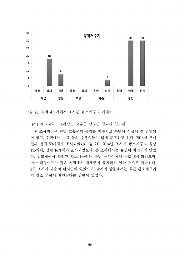 66 그림 20. 평척저수지에서 조사된 황소개구리 개체수 사 제 7지역 전라남도 고흥군 남양면 침교리 침교제 본 조사지점은 전남 고흥군의 농업용 저수지로 수변에 식생이 잘 발달되 어 있고, 수면에는 마름 등의 수생식물이 넓게 분포하고 있다. 2016년 조사 결과 성체 59개체가 조사되었다 그림 21 2014년 조사시 황소개구리 유생 115개체, 성체 16개체가 조사되었으나, 본 조사에서는 유생이 확인되지 않았 다. 침교제에서 확인된 황소개구리는 수변 웅덩이에서 주로 확인되었으며, 이는 대형어류가 적은 지점에서 개체군이 유지되고 있는 것으로 판단된다. 2차 조사시 다수의 낚시인이 있었으며, 낚시인 탐문에서는 최근 황소개구리 의 감소 경향이 확인된다는 답변이있었다.
