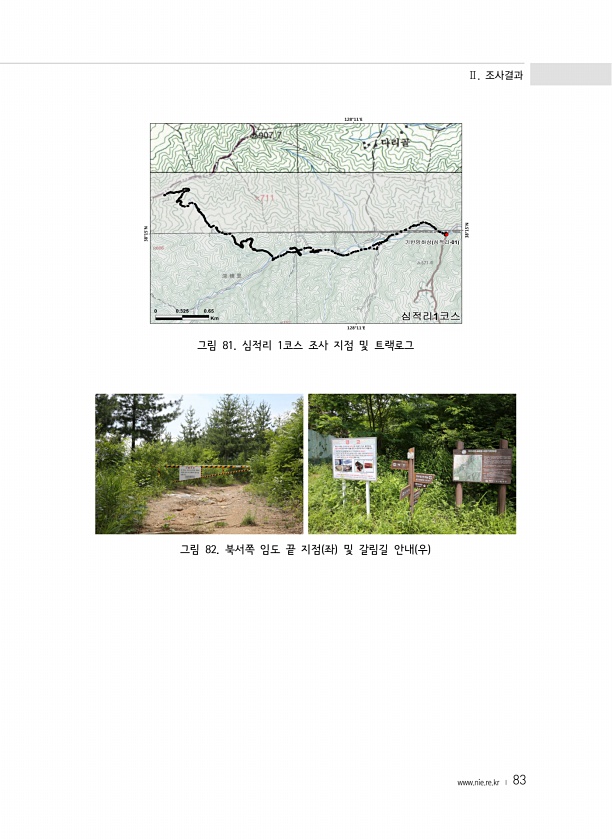 Ⅱ. 조사결과 www.nie.re.kr ? 83 그림 81. 심적리 1코스 조사 지점 및 트랙로그 그림 82. 북서쪽 임도 끝 지점 좌 및 갈림길 안내 우