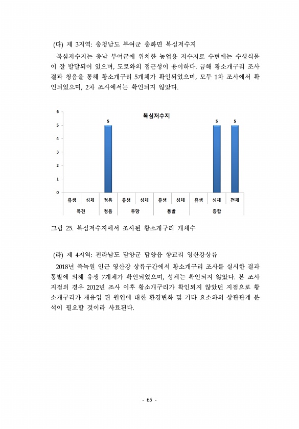 65 다 제 3지역충청남도 부여군 충화면 복심저수지 복심저수지는 충남 부여군에 위치한 농업용 저수지로 수변에는 수생식물 이 잘 발달되어 있으며, 도로와의 접근성이 용이하다. 금해 황소개구리 조사 결과 청음을 통해 황소개구리 5개체가 확인되었으며, 모두 1차 조사에서 확 인되었으며, 2차 조사에서는 확인되지 않았다. 그림 25. 복심저수지에서 조사된 황소개구리 개체수 라 제 4지역전라남도 담양군 담양읍 향교리 영산강상류 2018년 죽녹원 인근 영산강 상류구간에서 황소개구리 조사를 실시한 결과 통발에 의해 유생 7개체가 확인되었으며, 성체는 확인되지 않았다. 본 조사 지점의 경우 2012년 조사 이후 황소개구리가 확인되지 않았던 지점으로 황 소개구리가 재유입 된 원인에 대한 환경변화 및 기타 요소와의 상관관계 ...