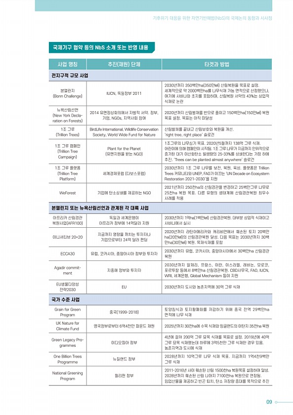 09 기후위기 대응을 위한 자연기반해법 NbS 의 국제논의 동향과 시사점 사업 명칭 추진 재원 단체 타겟과 방법 전지구적 규모 사업 본챌린지 Bonn Challenge IUCN, 독일정부 2011 2030년까지 350백만ha 350만㎢ 산림복원을 목표로 설정. 세계적으로 약 2000백만ha를 나무식재 가능 면적으로 산정했으나, 여기에 사바나와 초지를 포함하며, 산림복원 서약의 43%는 상업적 식재로 논란 뉴욕산림선언 New York Declaration on Forests 2014 유엔정상회의에서 자발적 서약. 정부, 기업, NGOs, 지역사회 참여 2020년까지 산림벌채를 반으로 줄이고 150백만ha 150만㎢ 복원 목표 설정. 목표는 아직 미달성 1조 그루 Trillion Trees BirdLife In...