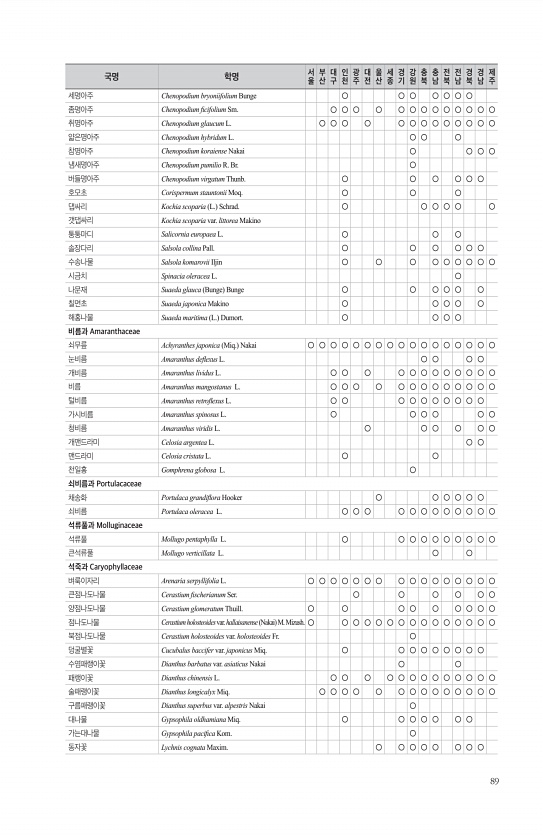 89 세명아주 Chenopodium bryoniifolium Bunge ○ ○ ○ ○ ○ ○ ○ 좀명아주 Chenopodium fcifolium Sm. ○ ○ ○ ○ ○ ○ ○ ○ ○ ○ ○ ○ ○ 취명아주 Chenopodium glaucum L. ○ ○ ○ ○ ○ ○ ○ ○ ○ ○ ○ ○ ○ 얇은명아주 Chenopodium hybridum L. ○ ○ ○ 참명아주 Chenopodium koraiense Nakai ○ ○ ○ ○ 냄새명아주 Chenopodium pumilio R. Br. ○ 버들명아주 Chenopodium virgatum Thunb. ○ ○ ○ ○ ○ ○ 호모초 Corispermum stauntonii Moq. ○ ○ ○ 댑싸리 Kochia scoparia L. Schrad. ○ ○ ○ ○ ...