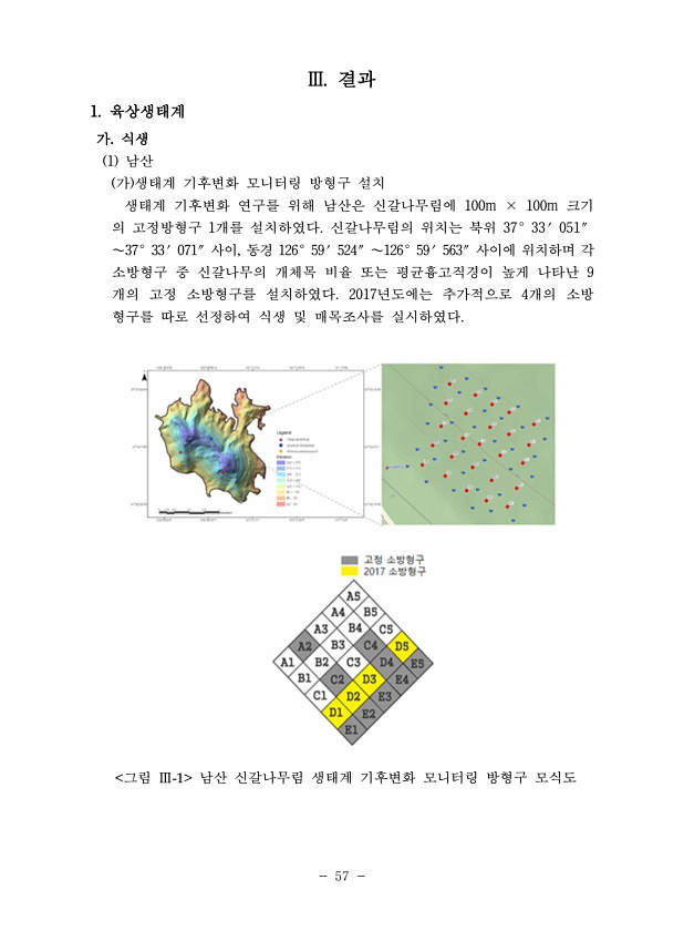 57 III. 결과 1. 육상생태계 가. 식생 1 남산 가 생태계 기후변화 모니터링 방형구 설치 생태계 기후변화 연구를 위해 남산은 신갈나무림에 100m × 100m 크기 의 고정방형구 1개를 설치하였다. 신갈나무림의 위치는 북위 37°33′051″ ∼37°33′071″사이, 동경 126°59′524″∼126°59′563″사이에 위치하며 각 소방형구 중 신갈나무의 개체목 비율 또는 평균흉고직경이 높게 나타난 9 개의 고정 소방형구를 설치하였다. 2017년도에는 추가적으로 4개의 소방 형구를 따로 선정하여 식생 및 매목조사를 실시하였다. 그림 Ⅲ-1 남산 신갈나무림 생태계 기후변화 모니터링 방형구모식도