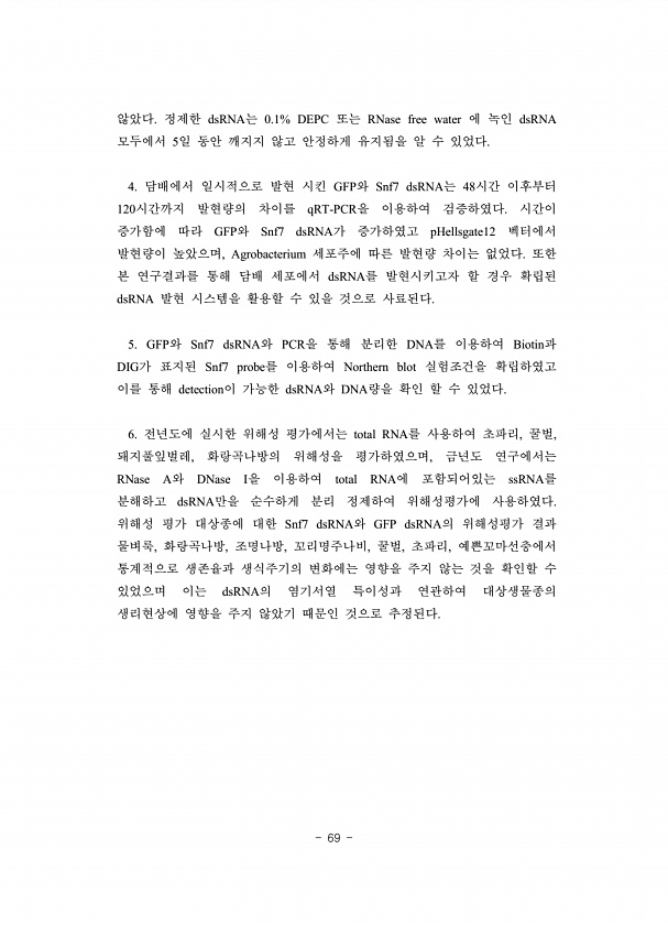 69 않았다. 정제한 dsRNA는 0.1% DEPC 또는 RNase free water 에 녹인 dsRNA 모두에서 5일 동안 깨지지 않고 안정하게 유지됨을 알 수 있었다. 4. 담배에서 일시적으로 발현 시킨 GFP와 Snf7 dsRNA는 48시간 이후부터 120시간까지 발현량의 차이를 qRT-PCR을 이용하여 검증하였다. 시간이 증가함에 따라 GFP와 Snf7 dsRNA가 증가하였고 pHellsgate12 벡터에서 발현량이 높았으며, Agrobacterium 세포주에 따른 발현량 차이는 없었다. 또한 본 연구결과를 통해 담배 세포에서 dsRNA를 발현시키고자 할 경우 확립된 dsRNA 발현 시스템을 활용할 수 있을 것으로 사료된다. 5. GFP와 Snf7 dsRNA와 PCR을 통해 분리한 DNA를 이용하여...