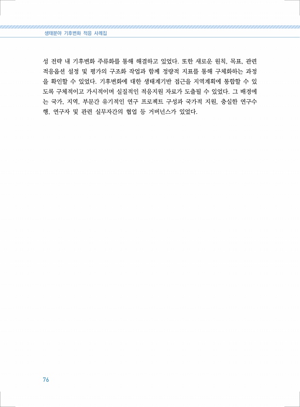 생태분야 기후변화 적응 사례집 76 성 전략 내 기후변화 주류화를 통해 해결하고 있었다. 또한 새로운 원칙, 목표, 관련 적응옵션 설정 및 평가의 구조화 작업과 함께 정량적 지표를 통해 구체화하는 과정 을 확인할 수 있었다. 기후변화에 대한 생태계기반 접근을 지역계획에 통합할 수 있 도록 구체적이고 가시적이며 실질적인 적응지원 자료가 도출될 수 있었다. 그 배경에 는 국가, 지역, 부문간 유기적인 연구 프로젝트 구성과 국가적 지원, 충실한 연구수 행, 연구자 및 관련 실무자간의 협업 등 거버넌스가있었다.