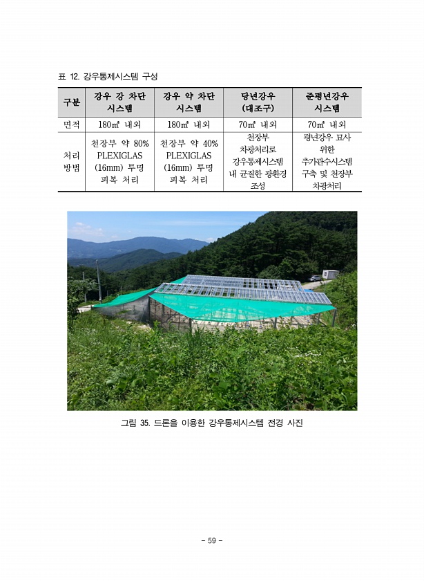 구분 강우 강 차단 시스템 강우 약 차단 시스템 당년강우 대조구 준평년강우 시스템 면적 180㎡ 내외 180㎡ 내외 70㎡ 내외 70㎡ 내외 처리 방법 천장부 약 80% PLEXIGLAS 16mm 투명 피복 처리 천장부 약 40% PLEXIGLAS 16mm 투명 피복 처리 천장부 차광처리로 강우통제시스템 내 균질한 광환경 조성 평년강우 묘사 위한 추가관수시스템 구축 및 천장부 차광처리 표 12. 강우통제시스템 구성 그림 35. 드론을 이용한 강우통제시스템 전경 사진 59