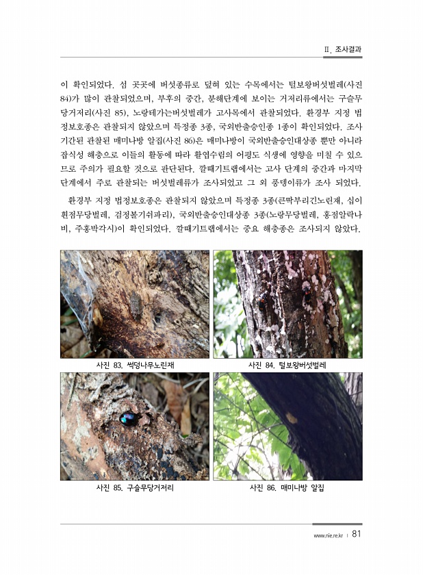 Ⅱ. 조사결과 www.nie.re.kr ? 81 이 확인되었다. 섬 곳곳에 버섯종류로 덮혀 있는 수목에서는 털보왕버섯벌레 사진 84 가 많이 관찰되었으며, 부후의 중간, 분해단계에 보이는 거저리류에서는 구슬무 당거저리 사진 85 , 노랑테가는버섯벌레가 고사목에서 관찰되었다. 환경부 지정 법 정보호종은 관찰되지 않았으며 특정종 3종, 국외반출승인종 1종이 확인되었다. 조사 기간된 관찰된 매미나방 알집 사진 86 은 매미나방이 국외반출승인대상종 뿐만 아니라 잡식성 해충으로 이들의 활동에 따라 활엽수림의 어평도 식생에 영향을 미칠 수 있으 므로 주의가 필요할 것으로 판단된다. 깔때기트랩에서는 고사 단계의 중간과 마지막 단계에서 주로 관찰되는 버섯벌레류가 조사되었고 그 외 풍뎅이류가 조사 되었다. 환경부 지정 법정...